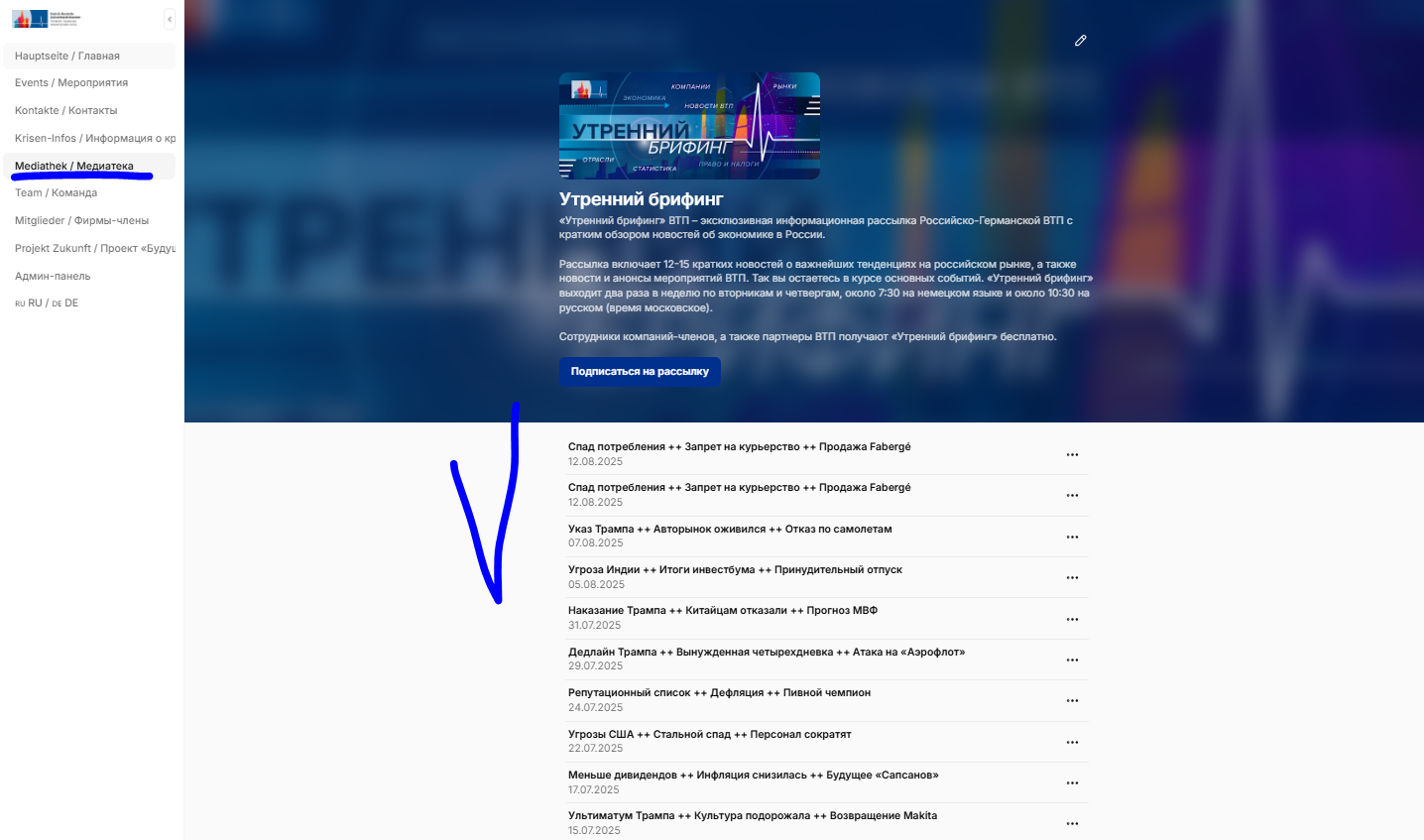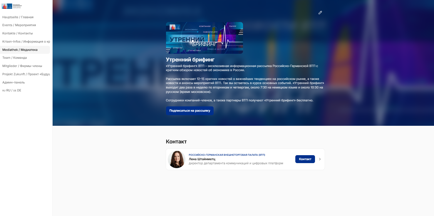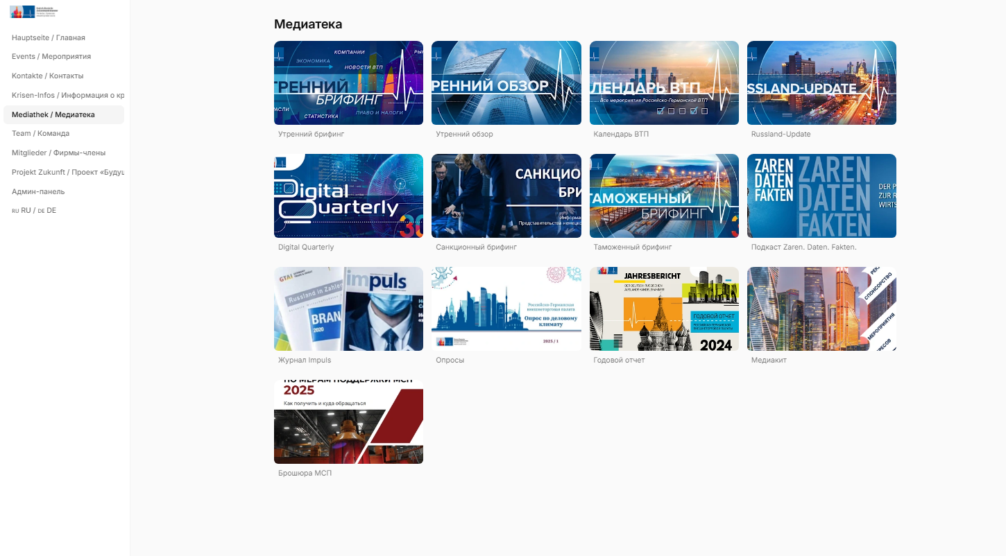 Частая ошибка: при просмотре раздела материалов список публикаций не отображается. Это происходит, когда не выбран язык интерфейса. Чтобы исправить ситуацию, перейдите на страницу выбора языка «RU DE», выберите необходимый язык, а затем вернитесь в нужный раздел сайта. После этого все материалы станут доступны для просмотра.