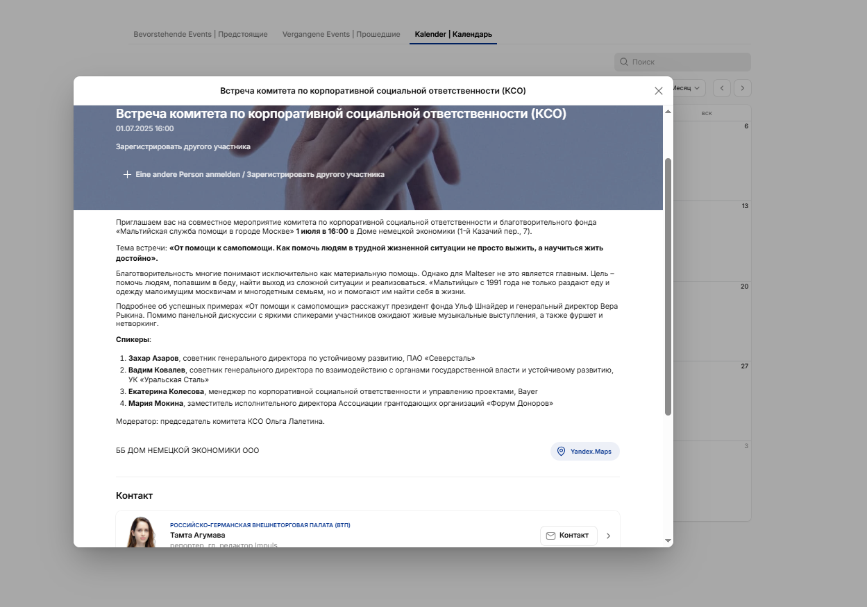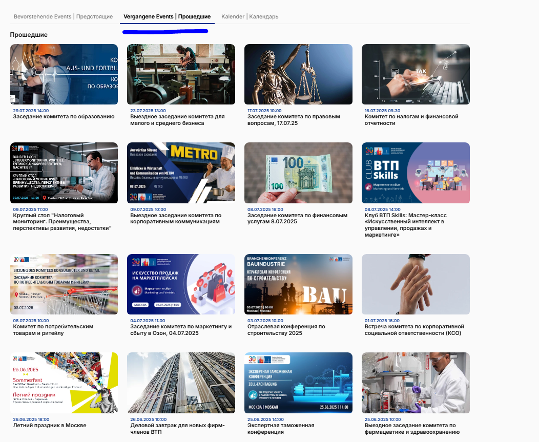 Самая посещаемая страница на нашем сайте — «Мероприятия». Здесь вы найдёте анонсы всех предстоящих ивентов, архив состоявшихся событий, а также удобное календарное отображение всех мероприятий, что позволит легко планировать своё участие. Кроме того, напоминаем, что полный архив всех мероприятий и кампаний доступен в нашей CRM-системе, а также представлен в виде подробного отчёта в Power BI для более глубокого анализа и мониторинга.