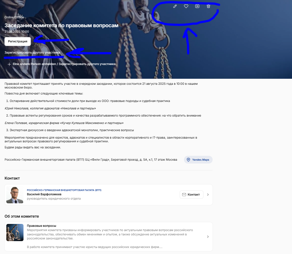 Для редактирования мероприятия откройте его карточку через представление «Предстоящие». В правом верхнем углу страницы вы увидите инструменты для редактирования. С их помощью вы сможете заменить изображение, скорректировать программу на двух языках и внести другие необходимые изменения. Пожалуйста, обязательно внимательно вычитывайте все тексты перед публикацией на сайте, чтобы избежать ошибок и обеспечить высокое качество информации для пользователей.